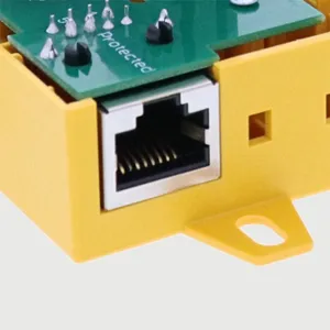 Space-saving, compact surge arrester in a surface-mounted plastic enclosure with push-in connection technology and status indication for protecting one pair of unearthed balanced interfaces, particularly telecommunication interfaces up to VVDSL and G.fast (up to 1 Gbit/s). Direct / indirect shield earthing possible. Connection of a pair or a patch cable with RJ45 plug at the output.