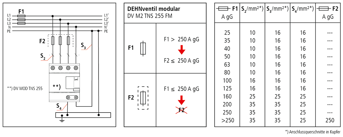 Bei Stichverdrahtung mit maximaler Vorsicherung wurde die bisher notwendige Vorsicherung von 315 A auf 250 A reduziert. Dies schafft mehr Platz im Anschlussraum von Niederspannungsschaltanlagen. Ein weiterer Vorteil: Kürzere Leitungslängen zum Anschluss des Kombi-Ableiters ermöglichen den Einsatz des kleineren NH1-Sicherungslasttrenners statt des vorher notwendigen NH2-Trenners.