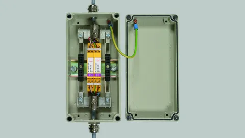 Lightning-current-tested shield terminals with accessories for lightning equipotential bonding of cable shields and aluminium enclosures for DIN rail mounted devices.