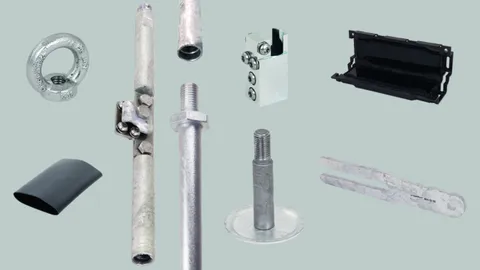 Earth rods for installing single earth electrodes for lightning protection systems and plants including connecting clamps.