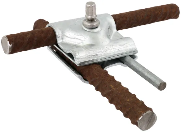 MAXI multipurpose connecting clamp (MAXI-MehrzweckVerbindungs-Klemme) for universal use as a cross clamp, T clamp and parallel clamp, for connecting earth rods or reinforcing bars; three-piece, with thread in the base part.