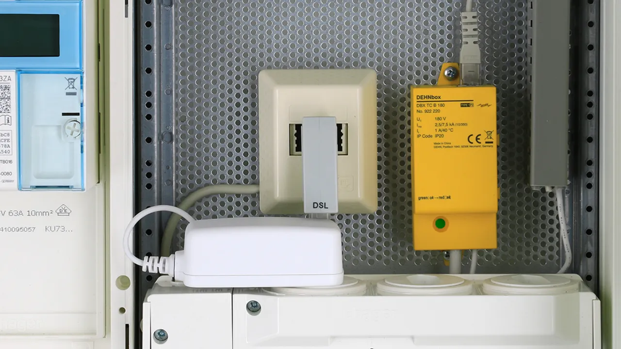 Space-saving, compact surge arrester in a surface-mounted plastic enclosure with push-in connection technology and status indication for protecting one pair of unearthed balanced interfaces, particularly telecommunication interfaces up to VVDSL and G.fast (up to 1 Gbit/s). Direct / indirect shield earthing possible. Connection of a pair or a patch cable with RJ45 plug at the output.
