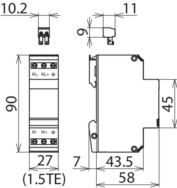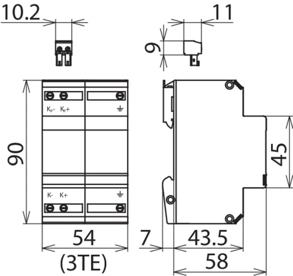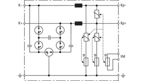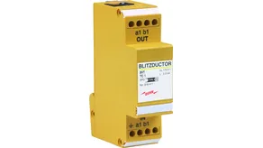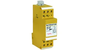 Energy coordinated combined arrester for protecting the rectifier in the protective circuit (red colour). Pluggable remote signalling contact (break contact) for overload indication (temperature monitoring of the varistors). Installation in sheet metal housing recommended. Low impulse sparkover voltage due to capacitive control.