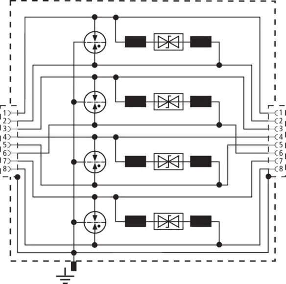 Universal, space-saving lightning current arrester of 19 mm in width and RJ45 connection system for lightning equipotential bonding. Protection of applications in structured cabling according to class S to 100 MHz; e.g. industrial Ethernet, data distributors, digital camera systems, Power over Ethernet (IEEE 802.3 compliant to 4PPoE) and Ethernet-based interfaces in general. Protection of all pairs through powerful gas discharge tubes. Fully shielded adapter design with RJ45 sockets for DIN rail mounting. With additional screw connection on the enclosure for an optional earth connection.