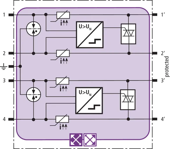 Space-saving combined lightning current and surge arrester module with actiVsense technology and RFID LifeCheck for protecting two pairs (same or different operating voltage) of balanced interfaces with galvanic isolation. Automatically detects the operating voltage of the useful signal and optimally adapts the voltage protection level to it.