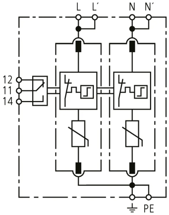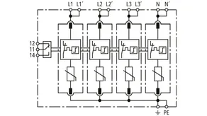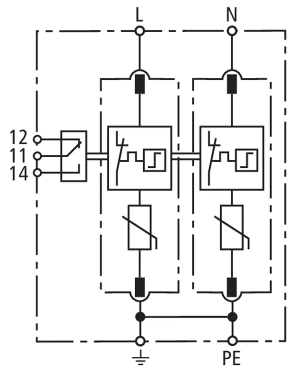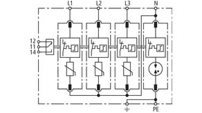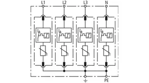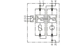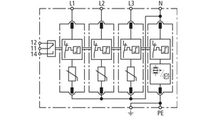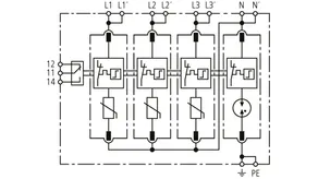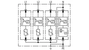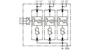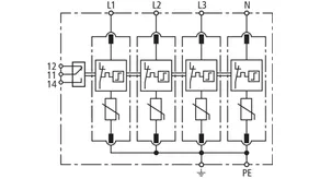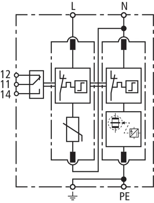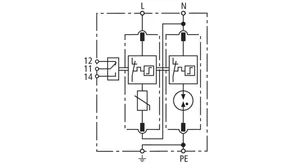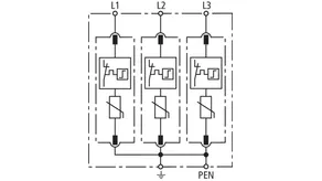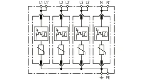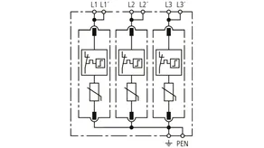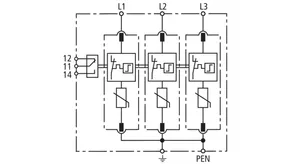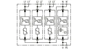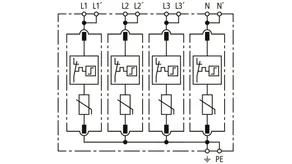 Modular surge arrester with a high total discharge capacity in the N-PE path for TT and TN systems (1+1 configuration); meets increased safety requirements by higher discharge capability; with floating remote signalling contact.