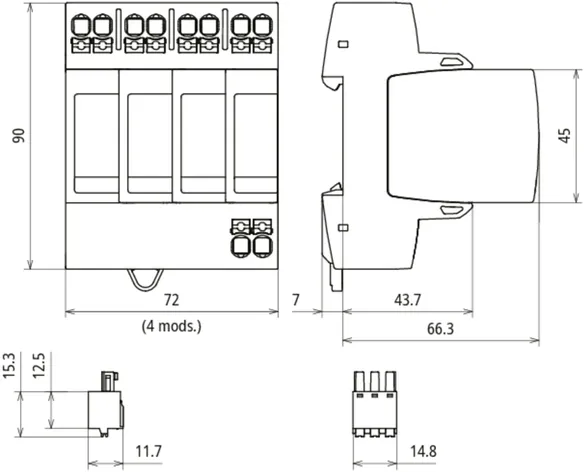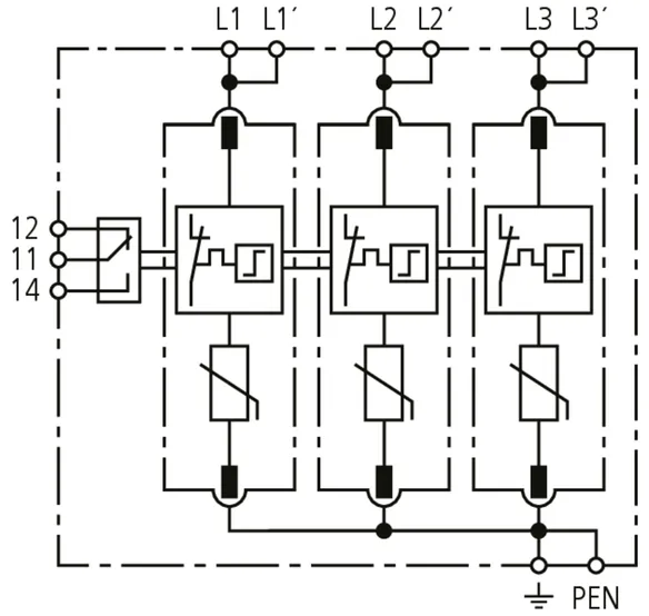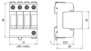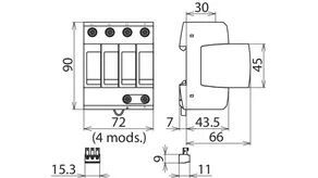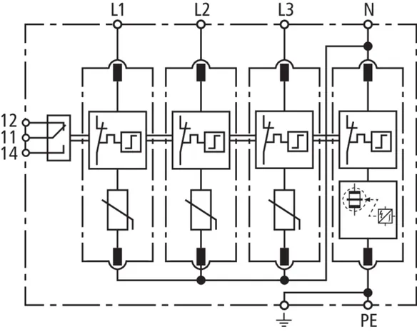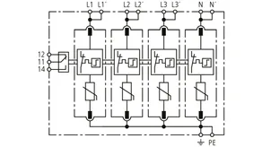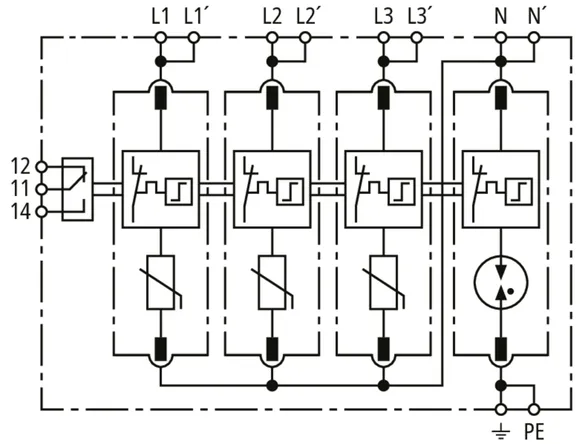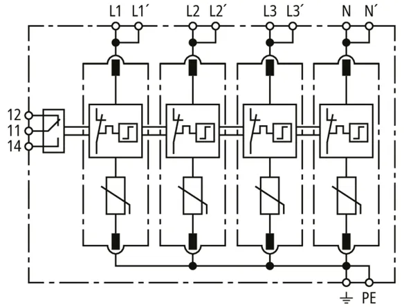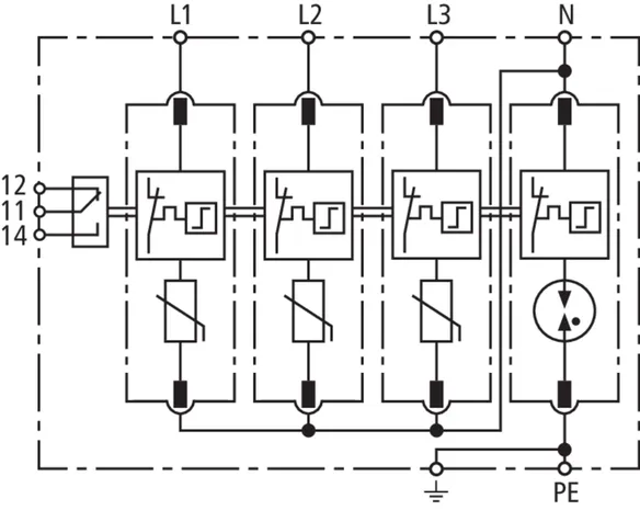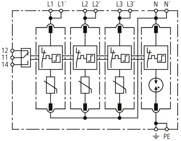 Modular surge arrester for TT and TN-S systems (3+1 configuration); with floating remote signalling contact.