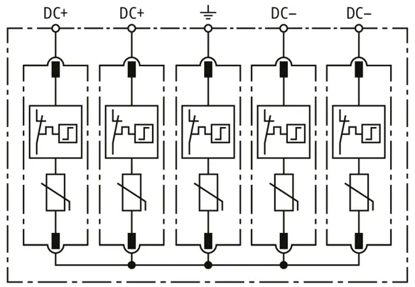 | Max. discharge current (8/20 µs) [(DC+/DC-) --> PE] (Imax ) | 40 kA |