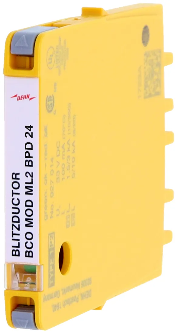 Combined arrester protection module with a width of 6 mm for BLITZDUCTORconnect with status indication for protecting one pair in 24 V DC systems. Also suitable for use with an earthed negative pole. Integrated PTC resistors allow for secure resetting of the arrester after interference in the system circuit with short-circuit currents of up to 40 A.