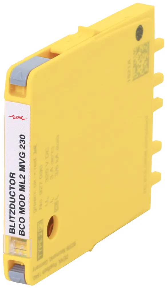 Surge arrester protection module with a width of 6 mm for BLITZDUCTORconnect with status indication for protecting 2 lines of stranded unearthed signal interfaces with a nominal voltage of 230 V.