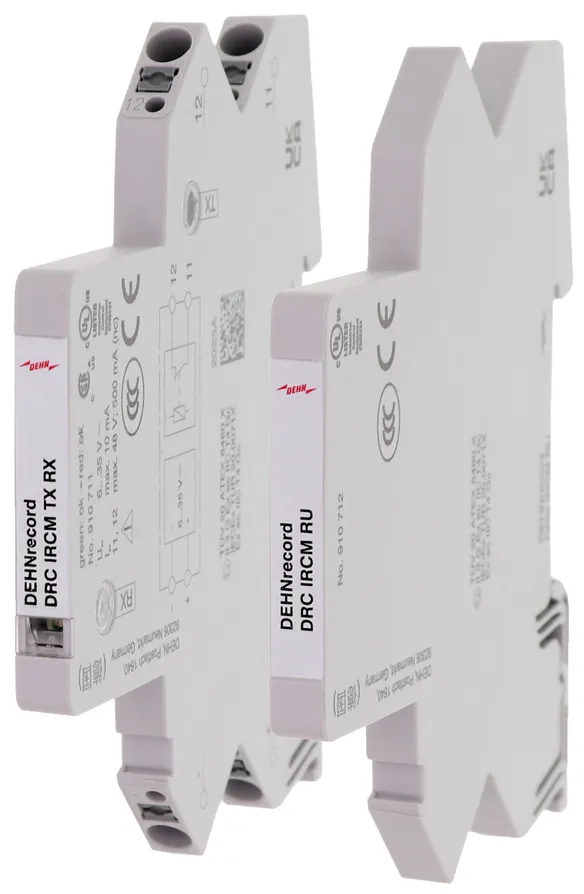 Condition monitoring unit DEHNrecord, set for DIN rail mounted devices with integrated visual transmitter/receiver and visual reverse BLITZDUCTORconnect arresters and DEHNpatch with LifeCheck. Visual arrester status indication via LED group display in combination with remote signalling contact (break contact).