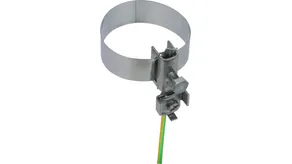 Earthing pipe clamps for integrating pipes into the protective and functional equipotential bonding according to IEC 60364-4-41/5-54, with continuously adjustable tensioning strap.