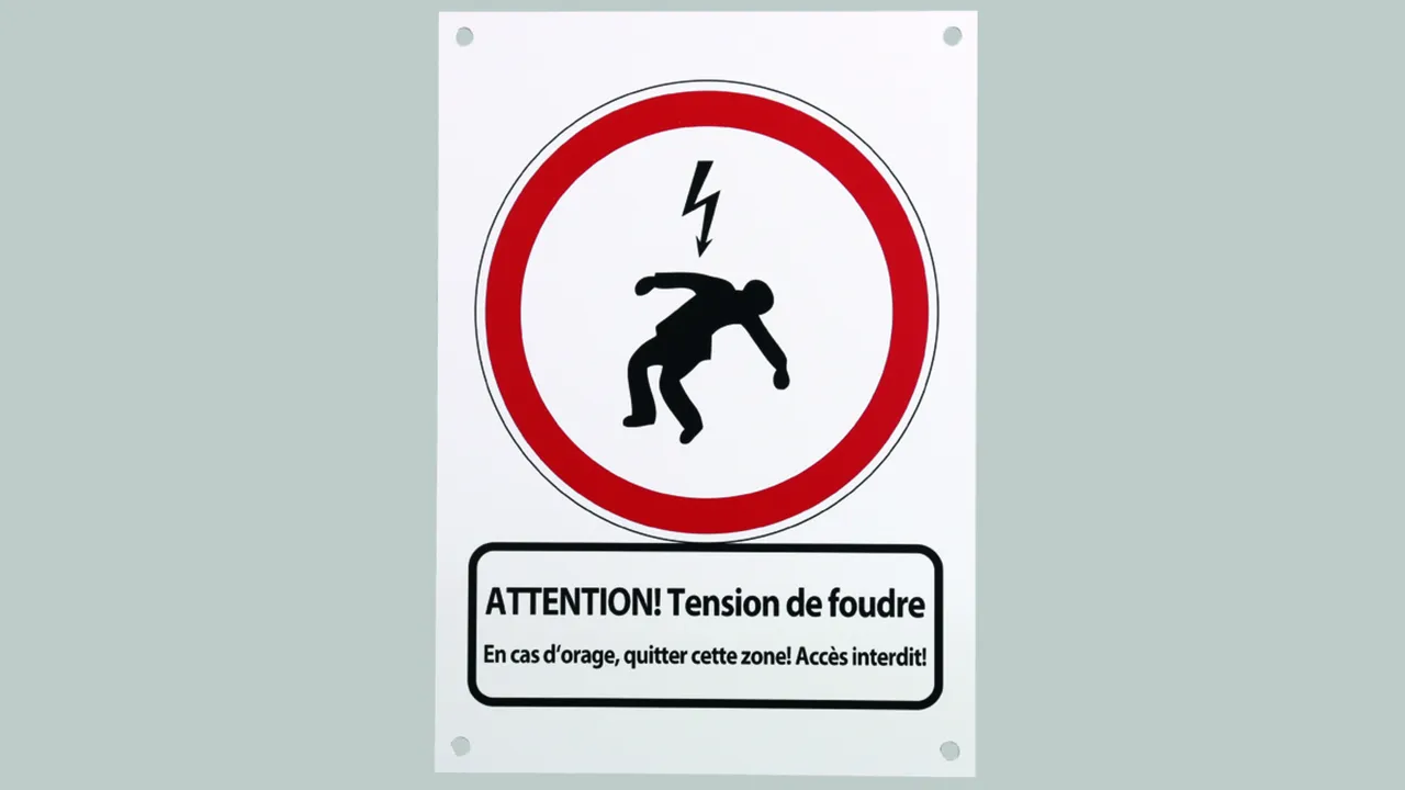Plaque signalétique Attention Tension de foudre Plaque signalétique Impression en allemand au recto : « ACHTUNG! Blitzspannung Bei Gewitter Bereich räumen / nicht betreten » Impression en anglais au verso : « ATTENTION! Lightning voltage Clear / do not enter this area during thunderstorms »