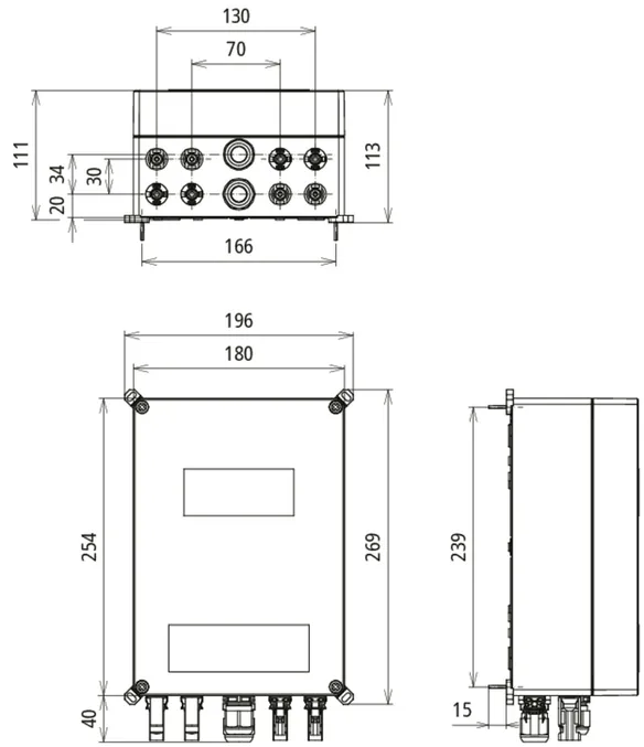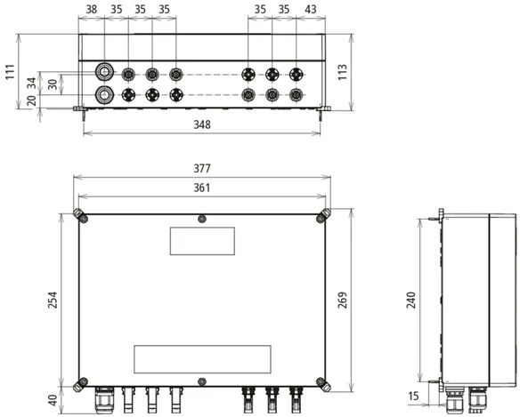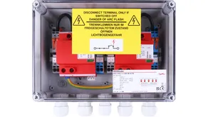 Coffret de raccordement de générateur pour systèmes photovoltaïques jusqu’à 1000 V DC, avec bornes de sectionnement, pour protéger trois entrées MPP et deux strings chacune.