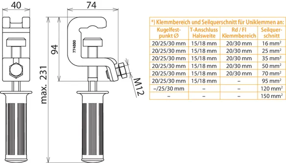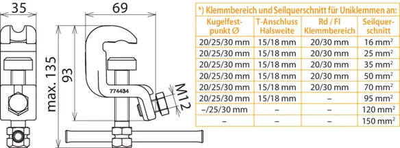 | *) Voir le tableau pour les plages de serrage et section max. de câble pour pinces universelles | |