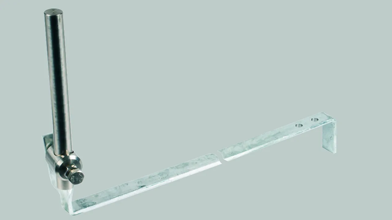 Comme base pour la fixation de pointes de capture sur des toits en bâtière, avec protection antitorsion (rondelle dentée) et contre-écrou. Les trous de fixation pour l'attacher à la charpente sont inclus.