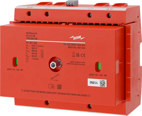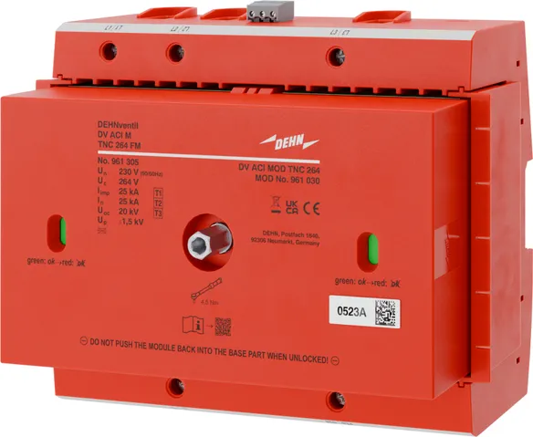 Set costituito da scaricatori di corrente di fulmine e di sovratensione innestabili, inclusa barra di cablaggio del modulo isolata applicabile in sistemi a inverter con anti-PID attivo, con offset DC massimo pari a 750 V DC. Collegamento degli impianti di messa a terra conforme alla norma IEC 60364-4-44, Tabella 44.A1 - collegamento tra RE e Z e tra RE e RA.