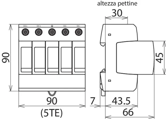 - Unità modulare completa pronta per il cablaggio per impianti fotovoltaici costituita da basetta e moduli di protezione innestati